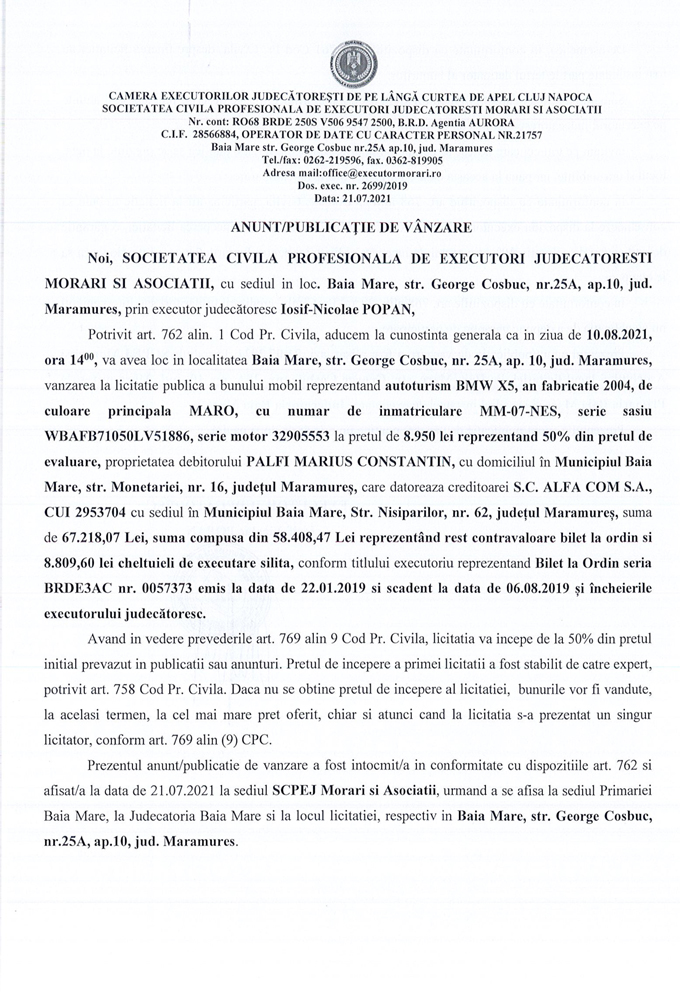 Noi, SOCIETATEA CIVILA PROFESIONALĂ DE EXECUTORI JUDECATOREȘTI MORARI ȘI ASOCIAȚII, cu sediul în loc. Baia Mare, str. George Cosbuc, nr. 25A, ap. 10, jud. Maramures, prin executor judecatoresc Iosif-Nicolae POPAN,
