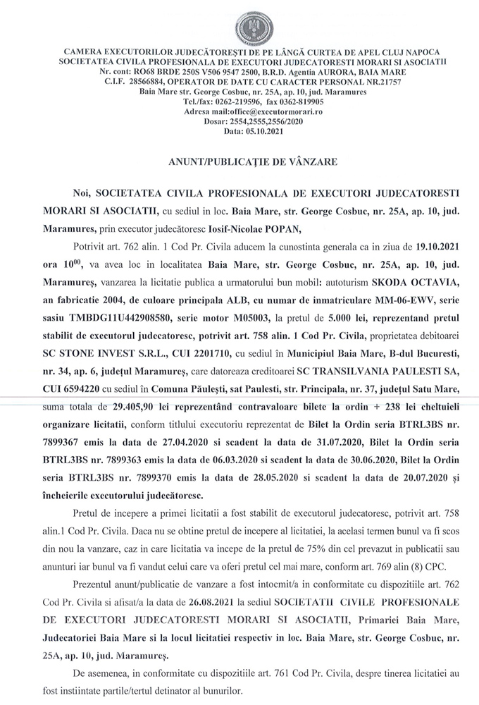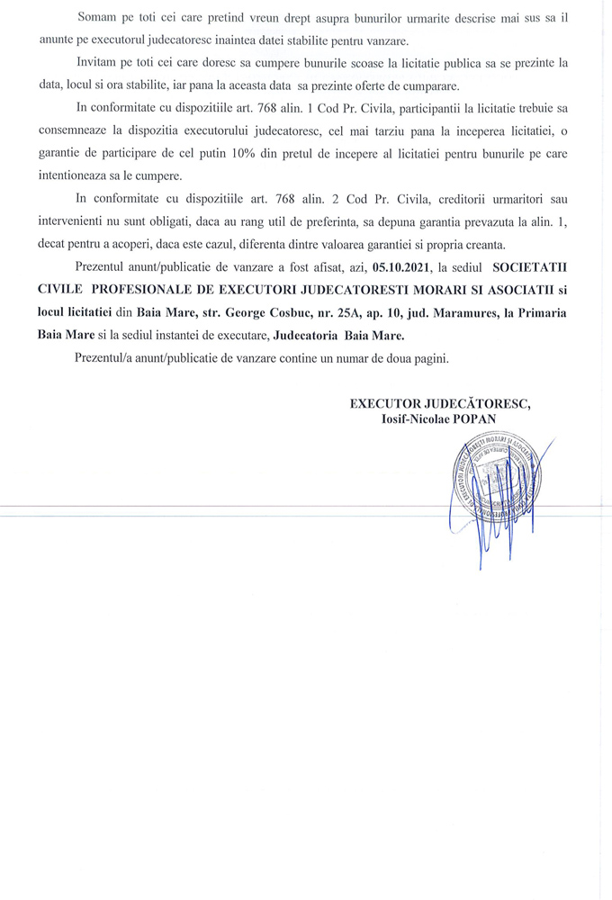 Noi, SOCIETATEA CIVILA PROFESIONALĂ DE EXECUTORI JUDECATOREȘTI MORARI ȘI ASOCIAȚII, cu sediul în loc. Baia Mare, str. George Cosbuc, nr. 25A, ap. 10, jud. Maramures, prin executor judecatoresc Iosif-Nicolae POPAN,