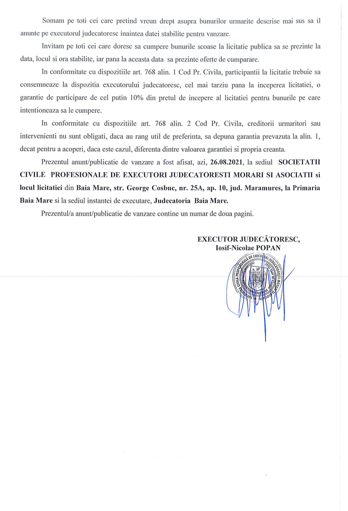 Noi, SOCIETATEA CIVILA PROFESIONALĂ DE EXECUTORI JUDECATOREȘTI MORARI ȘI ASOCIAȚII, cu sediul în loc. Baia Mare, str. George Cosbuc, nr. 25A, ap. 10, jud. Maramures, prin executor judecatoresc Iosif-Nicolae POPAN,