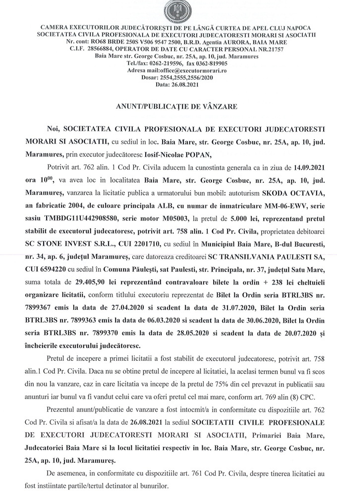Noi, SOCIETATEA CIVILA PROFESIONALĂ DE EXECUTORI JUDECATOREȘTI MORARI ȘI ASOCIAȚII, cu sediul în loc. Baia Mare, str. George Cosbuc, nr. 25A, ap. 10, jud. Maramures, prin executor judecatoresc Iosif-Nicolae POPAN,