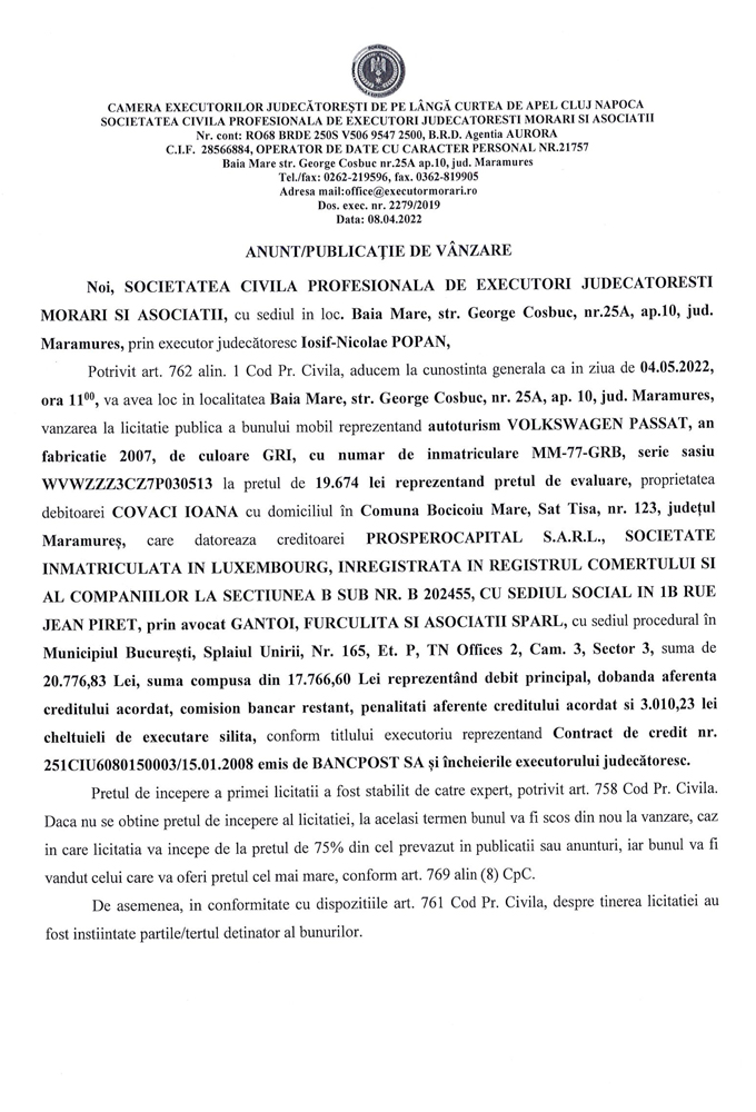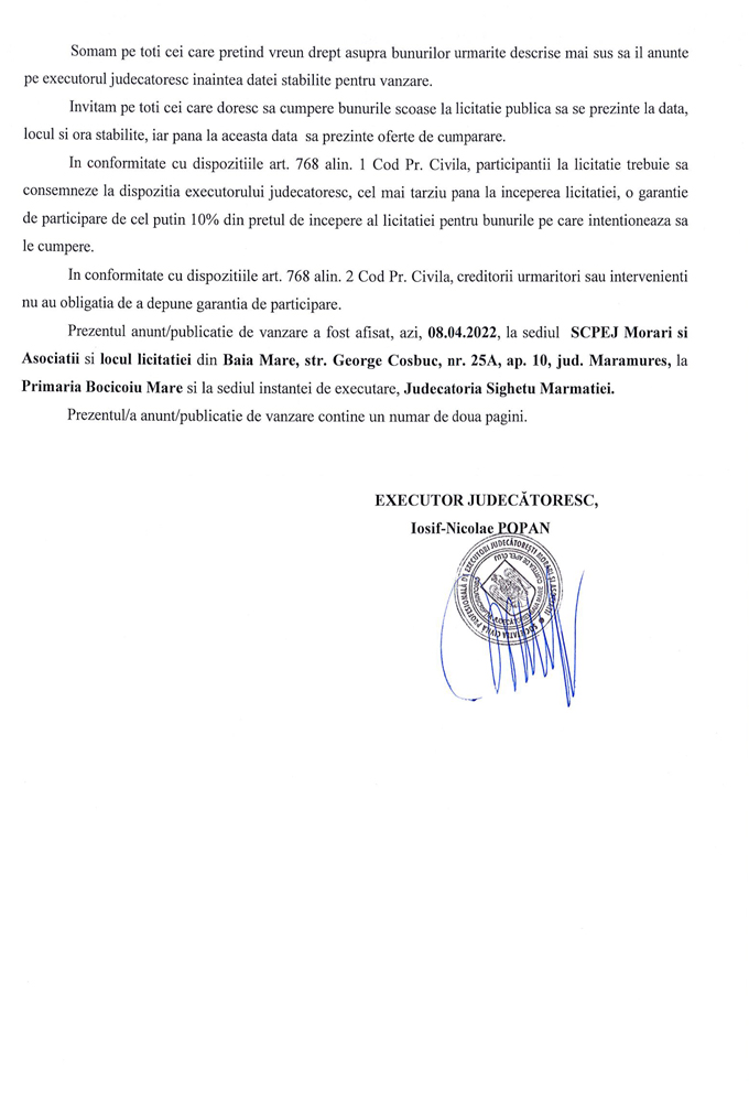 Noi, SOCIETATEA CIVILA PROFESIONALĂ DE EXECUTORI JUDECATOREȘTI MORARI ȘI ASOCIAȚII, cu sediul în loc. Baia Mare, str. George Cosbuc, nr. 25A, ap. 10, jud. Maramures, prin executor judecatoresc Iosif-Nicolae POPAN,
