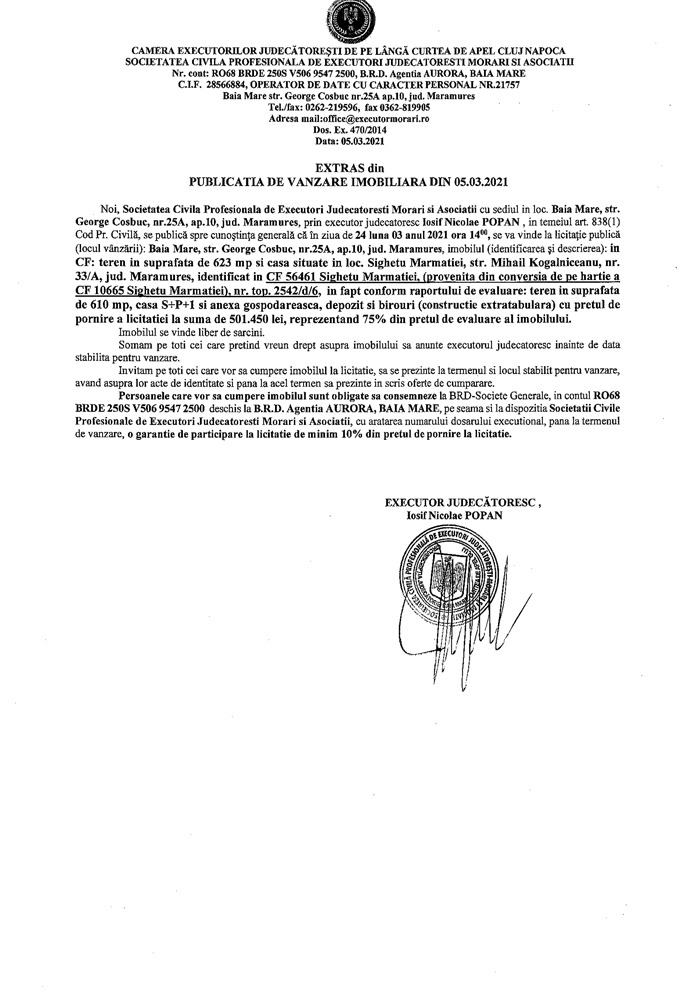 Noi, Societatea Civilă Profesională de Executori Judecătorești Morari și Asociații cu sediul în loc. Baia Mare, str. George Coșbuc, nr. 25A, ap. 10, jud. Maramureș, prin executor judecătoresc Iosif Nicolae POPAN în temeiul art. 838(1) Cod. Pr. Civilă, se publică spre cunoștința generală că în ziua de 24 luna 03 anul 2021 ora 14.00 se va vinde la licitație publică (locul vânzării): Baia Mare, str. George Coșbuc, nr. 25A, ap. 10, jud Maramureș din imobilul descris în documentul de mai jos:
