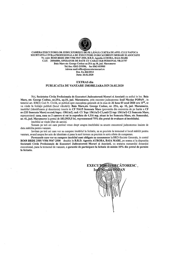 Noi, Societatea Civila Profesionala de Executori Judecatoresti Morari si Asociatii cu sediul in loc. Baia Mare, str. George Cosbuc, nr. 25A, ap. 10, jud. Maramures, prin executor judecatoresc Iosif Nicolae POPAN, in temeiul art. 838(1) Cod. Pr. Civila, se publica spre cunostinta generala ca in ziua de 26 luna 03 anul 2020 ora 11.00, se va vinde la licitatie publica (locul vanzarii): Baia Mare, str. George Cosbuc, nr. 25A, ap. 10, jud Maramures din imobilul descris in documentul de mai jos: