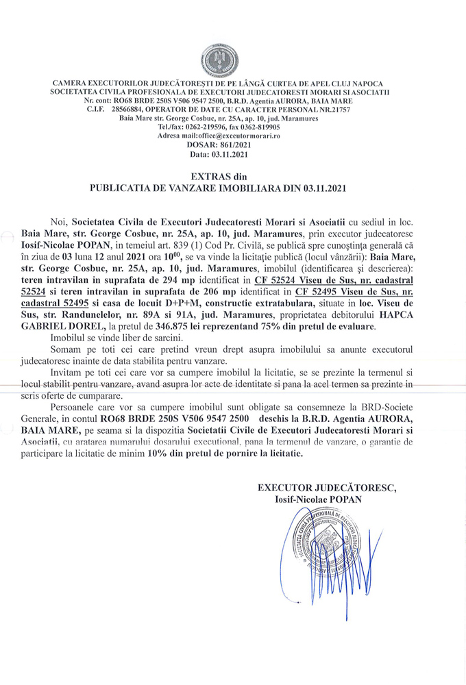 Noi, Societatea Civilă Profesională de Executori Judecătorești Morari și Asociații cu sediul în loc. Baia Mare, str. George Coșbuc, nr. 25A, ap. 10, jud. Maramureș, prin executor judecătoresc Iosif-Nicolae POPAN în temeiul art. 839 (1) Cod. Pr. Civilă, se publică spre cunoștința generală că în ziua de 03 luna 12 anul 2021 ora 10.00, se va vinde la licitație publică (locul vânzării): Baia Mare, str. George Coșbuc, nr. 25A, ap. 10, jud Maramureș, imobilul descris în documentul de mai jos: