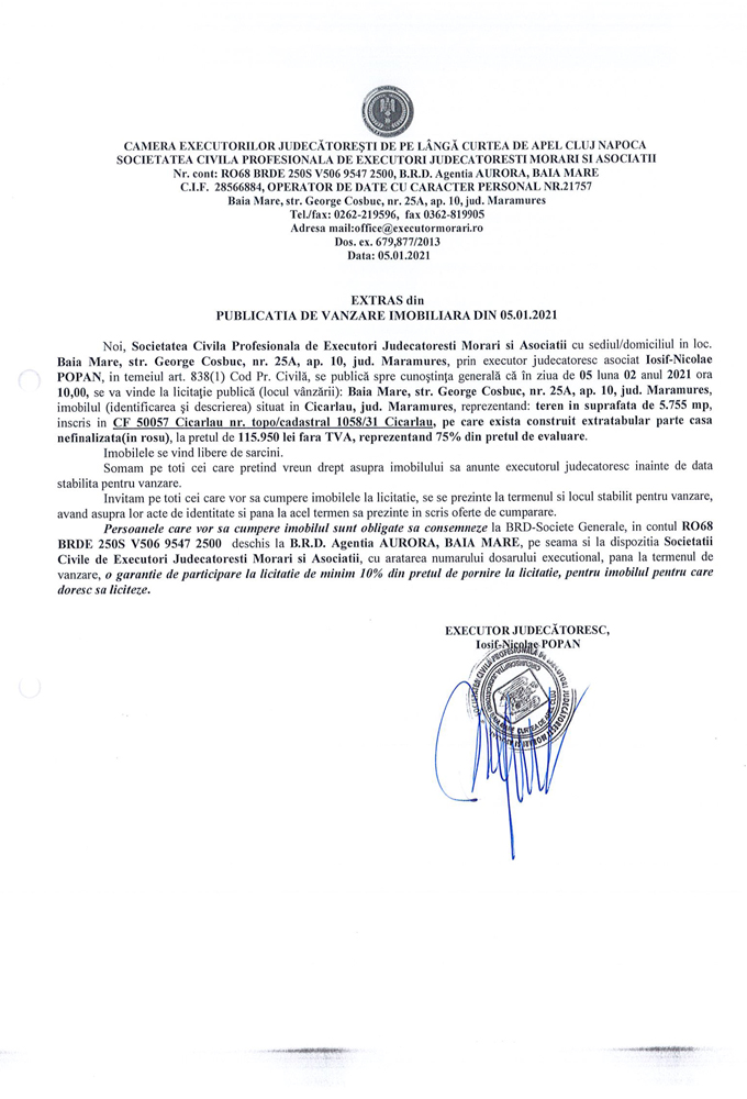 saNoi, Societatea Civilă Profesională de Executori Judecătorești Morari și Asociații cu sediul/domiciliul în loc. Baia Mare, str. George Coșbuc, nr. 25A, ap. 10, jud. Maramureș, prin executor judecătoresc Iosif-Nicolae POPAN în temeiul art. 838(1) Cod. Pr. Civilă, se publică spre cunoștința generală că în ziua de 05 luna 02 anul 2021 ora 10,00 se va vinde la licitație publică (locul vânzării): Baia Mare, str. George Coșbuc, nr. 25A, ap. 10, jud Maramureș din imobilul descris în documentul de mai jos: