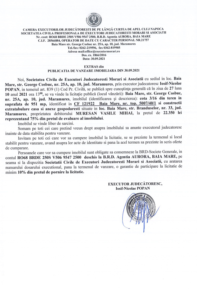Noi, Societatea Civilă Profesională de Executori Judecătorești Morari și Asociații cu sediul în loc. Baia Mare, str. George Coșbuc, nr. 25A, ap. 10, jud. Maramureș, prin executor judecătoresc Iosif-Nicolae POPAN în temeiul art. 839 (1) Cod. Pr. Civilă, se publică spre cunoștința generală că în ziua de 27 luna 10 anul 2021 ora 13.00, se va vinde la licitație publică (locul vânzării): Baia Mare, str. George Coșbuc, nr. 25A, ap. 10, jud Maramureș imobilul descris în documentul de mai jos: