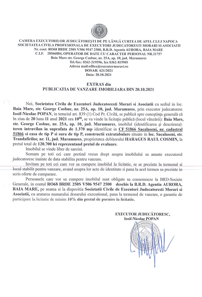 Noi, Societatea Civilă Profesională de Executori Judecătorești Morari și Asociații cu sediul în loc. Baia Mare, str. George Coșbuc, nr. 25A, ap. 10, jud. Maramureș, prin executor judecătoresc Iosif-Nicolae POPAN în temeiul art. 839 (1) Cod. Pr. Civilă, se publică spre cunoștința generală că în ziua de 20 luna 11 anul 2021 ora 10.00, se va vinde la licitație publică (locul vânzării): Baia Mare, str. George Coșbuc, nr. 25A, ap. 10, jud Maramureș, imobilul descris în documentul de mai jos:
