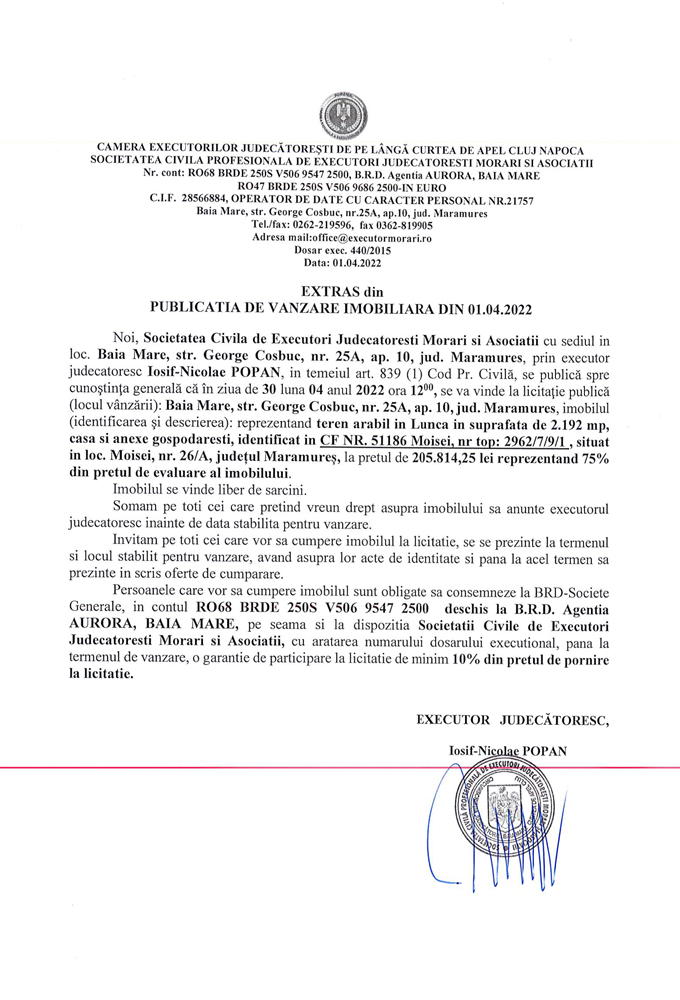 Noi, Societatea Civilă Profesională de Executori Judecătorești Morari și Asociații cu sediul în loc. Baia Mare, str. George Coșbuc, nr. 25A, ap. 10, jud. Maramureș, prin executor judecătoresc Iosif-Nicolae POPAN în temeiul art. 839 (1) Cod. Pr. Civilă, se publică spre cunoștința generală că în ziua de 30 luna 04 anul 2022 ora 12.00, se va vinde la licitație publică (locul vânzării): Baia Mare, str. George Coșbuc, nr. 25A, ap. 10, jud Maramureș, imobilul descris în documentul de mai jos: