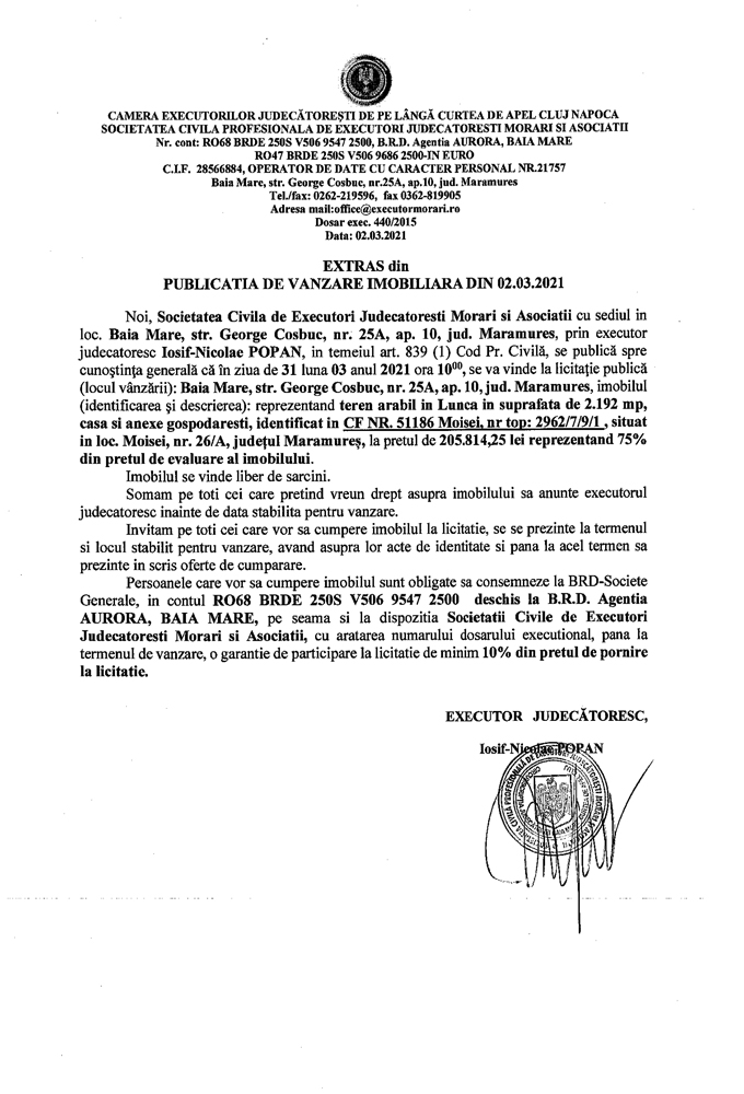 Noi, Societatea Civilă Profesională de Executori Judecătorești Morari și Asociații cu sediul în loc. Baia Mare, str. George Coșbuc, nr. 25A, ap. 10, jud. Maramureș, prin executor judecătoresc Iosif-Nicolae POPAN în temeiul art. 839 (1) Cod. Pr. Civilă, se publică spre cunoștința generală că în ziua de 31 luna 03 anul 2021 ora 10.00 se va vinde la licitație publică (locul vânzării): Baia Mare, str. George Coșbuc, nr. 25A, ap. 10, jud Maramureș din imobilul descris în documentul de mai jos: