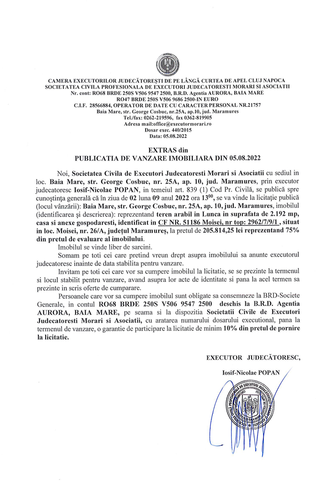 Noi, Societatea Civilă Profesională de Executori Judecătorești Morari și Asociații cu sediul în loc. Baia Mare, str. George Coșbuc, nr. 25A, ap. 10, jud. Maramureș, prin executor judecătoresc Iosif-Nicolae POPAN, în temeiul art. 839 (1) Cod. Pr. Civilă, se publică spre cunoștința generală că în ziua de 02 luna 09 anul 2022 ora 13.00, se va vinde la licitație publică (locul vânzării): Baia Mare, str. George Coșbuc, nr. 25A, ap. 10, jud Maramureș, imobilul descris în documentul de mai jos:
