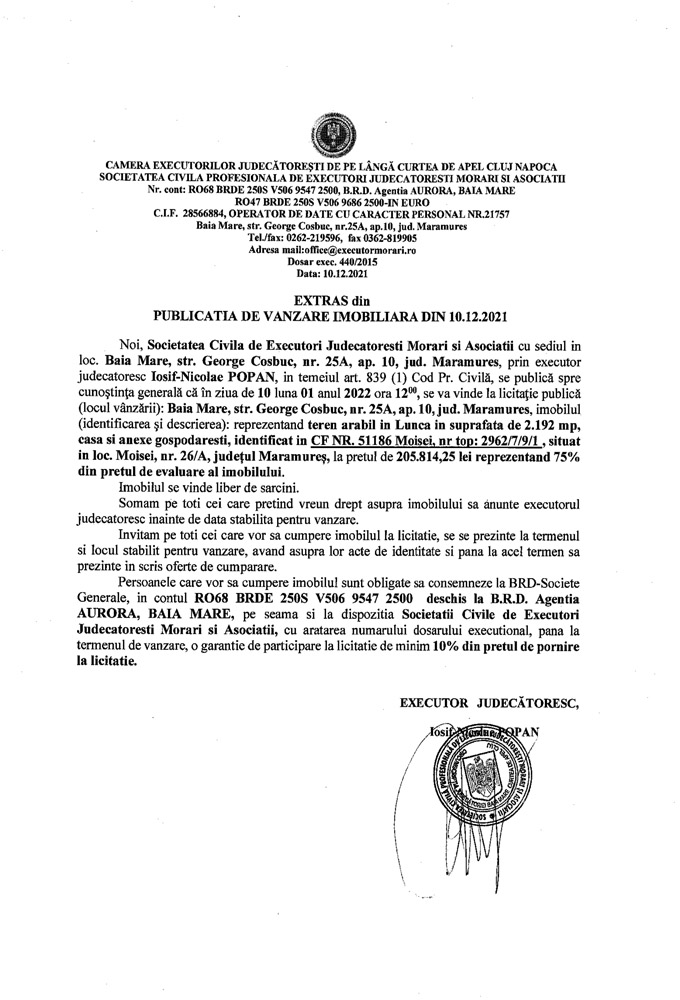 Noi, Societatea Civilă Profesională de Executori Judecătorești Morari și Asociații cu sediul în loc. Baia Mare, str. George Coșbuc, nr. 25A, ap. 10, jud. Maramureș, prin executor judecătoresc Iosif-Nicolae POPAN în temeiul art. 839 (1) Cod. Pr. Civilă, se publică spre cunoștința generală că în ziua de 10 luna 01 anul 2022 ora 12.00, se va vinde la licitație publică (locul vânzării): Baia Mare, str. George Coșbuc, nr. 25A, ap. 10, jud Maramureș, imobilul descris în documentul de mai jos: