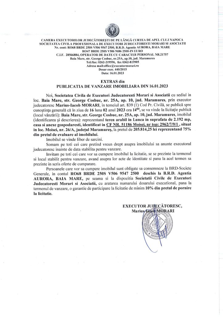 Vânzare casă și teren arabil în Moisei – Extras publicație imobiliară, din data de 16. 01. 2023