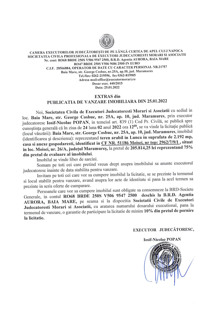 Noi, Societatea Civilă Profesională de Executori Judecătorești Morari și Asociații cu sediul în loc. Baia Mare, str. George Coșbuc, nr. 25A, ap. 10, jud. Maramureș, prin executor judecătoresc Iosif-Nicolae POPAN în temeiul art. 839 (1) Cod. Pr. Civilă, se publică spre cunoștința generală că în ziua de 24 luna 02 anul 2022 ora 12.00, se va vinde la licitație publică (locul vânzării): Baia Mare, str. George Coșbuc, nr. 25A, ap. 10, jud Maramureș, imobilul descris în documentul de mai jos: