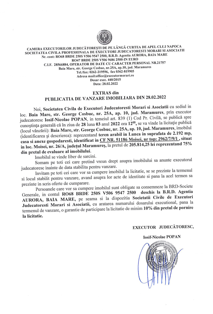 Noi, Societatea Civilă Profesională de Executori Judecătorești Morari și Asociații cu sediul în loc. Baia Mare, str. George Coșbuc, nr. 25A, ap. 10, jud. Maramureș, prin executor judecătoresc Iosif-Nicolae POPAN în temeiul art. 838(1) Cod. Pr. Civilă, se publică spre cunoștința generală că în ziua de 28 luna 03 anul 2022 ora 12.00, se va vinde la licitație publică (locul vânzării): Baia Mare, str. George Coșbuc, nr. 25A, ap. 10, jud Maramureș, imobilul descris în documentul de mai jos: