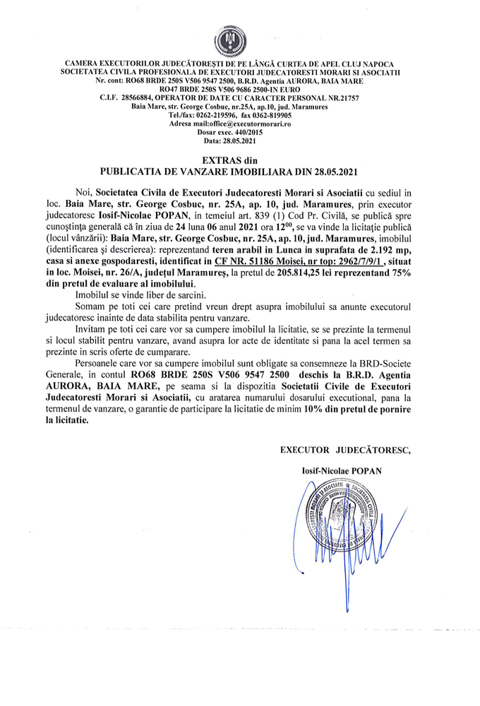 Noi, Societatea Civilă Profesională de Executori Judecătorești Morari și Asociații cu sediul în loc. Baia Mare, str. George Coșbuc, nr. 25A, ap. 10, jud. Maramureș, prin executor judecătoresc Iosif-Nicolae POPAN în temeiul art. 839 (1) Cod. Pr. Civilă, se publică spre cunoștința generală că în ziua de 24 luna 06 anul 2021 ora 12.00 se va vinde la licitație publică (locul vânzării): Baia Mare, str. George Coșbuc, nr. 25A, ap. 10, jud Maramureș imobilul descris în documentul de mai jos: