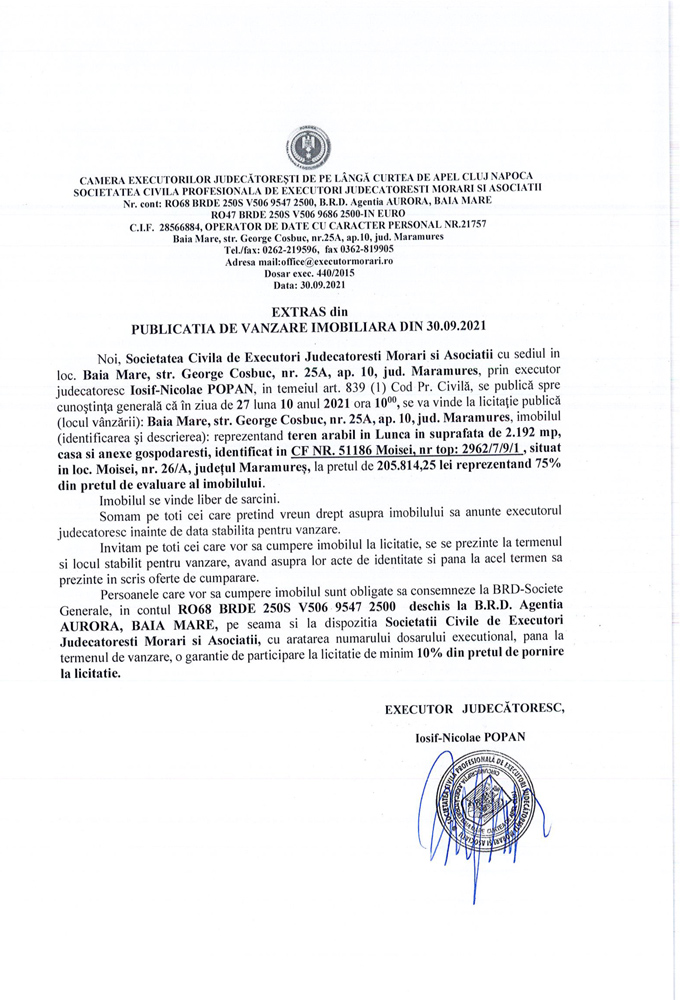 Noi, Societatea Civilă Profesională de Executori Judecătorești Morari și Asociații cu sediul în loc. Baia Mare, str. George Coșbuc, nr. 25A, ap. 10, jud. Maramureș, prin executor judecătoresc Iosif-Nicolae POPAN în temeiul art. 839 (1) Cod. Pr. Civilă, se publică spre cunoștința generală că în ziua de 27 luna 10 anul 2021 ora 10.00, se va vinde la licitație publică (locul vânzării): Baia Mare, str. George Coșbuc, nr. 25A, ap. 10, jud Maramureș imobilul descris în documentul de mai jos:
