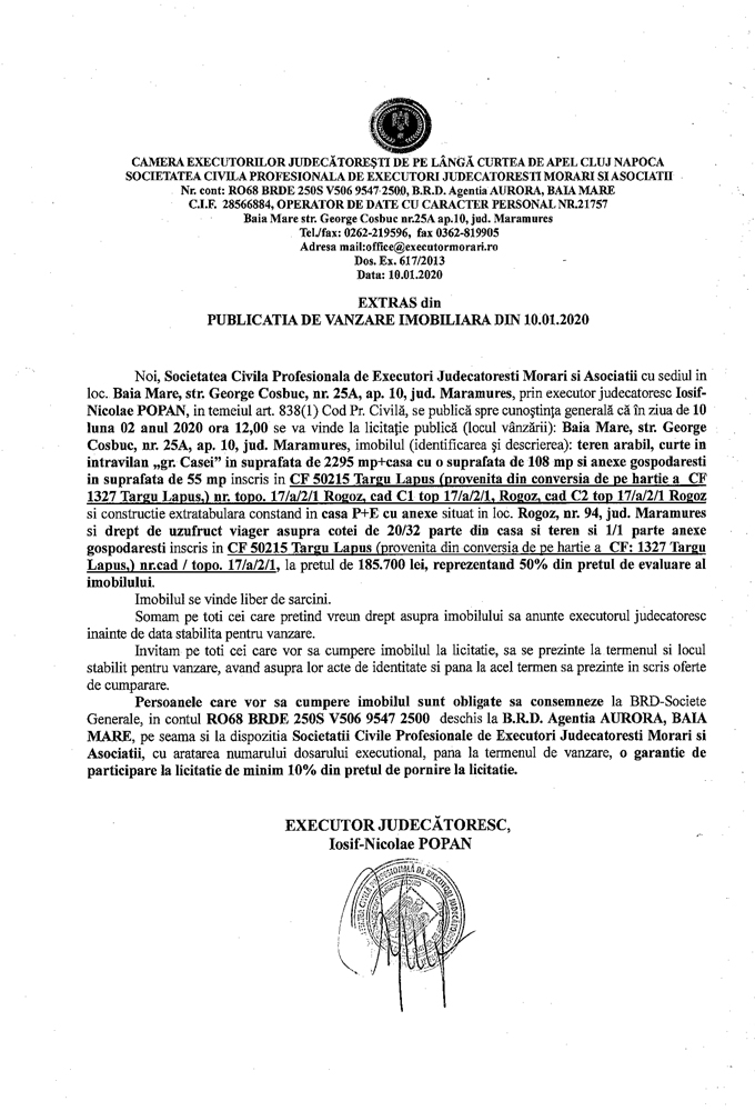 Noi, Societatea Civila Profesionala de Executori Judecatoresti Morari si Asociatii cu sediul in loc. Baia Mare, str. George Cosbuc, nr. 25A, ap. 10, jud. Maramures, prin executor judecatoresc Iosif-Nicolae POPAN, in temeiul art. 838(1) Cod. Pr. Civila, se publica spre cunostinta generala ca in ziua de 05 luna 02 anul 2020 ora 13.00, se va vinde la licitatie publica (locul vanzarii): Baia Mare, str. George Cosbuc, nr. 25A, ap. 10, jud Maramures, imobilul descris in documentul de mai jos: