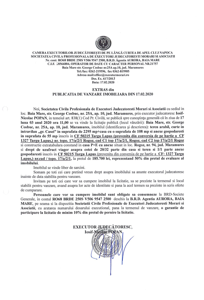 Noi, Societatea Civila Profesionala de Executori Judecatoresti Morari si Asociatii cu sediul in loc. Baia Mare, str. George Cosbuc, nr. 25A, ap. 10, jud. Maramures, prin executor judecatoresc Iosif-Nicolae POPAN, in temeiul art. 838(1) Cod. Pr. Civila, se publica spre cunostinta generala ca in ziua de 17 luna 03 anul 2020 ora 11,00, se va vinde la licitatie publica (locul vanzarii): Baia Mare, str. George Cosbuc, nr. 25A, ap. 10, jud Maramures, imobilul descris in documentul de mai jos: