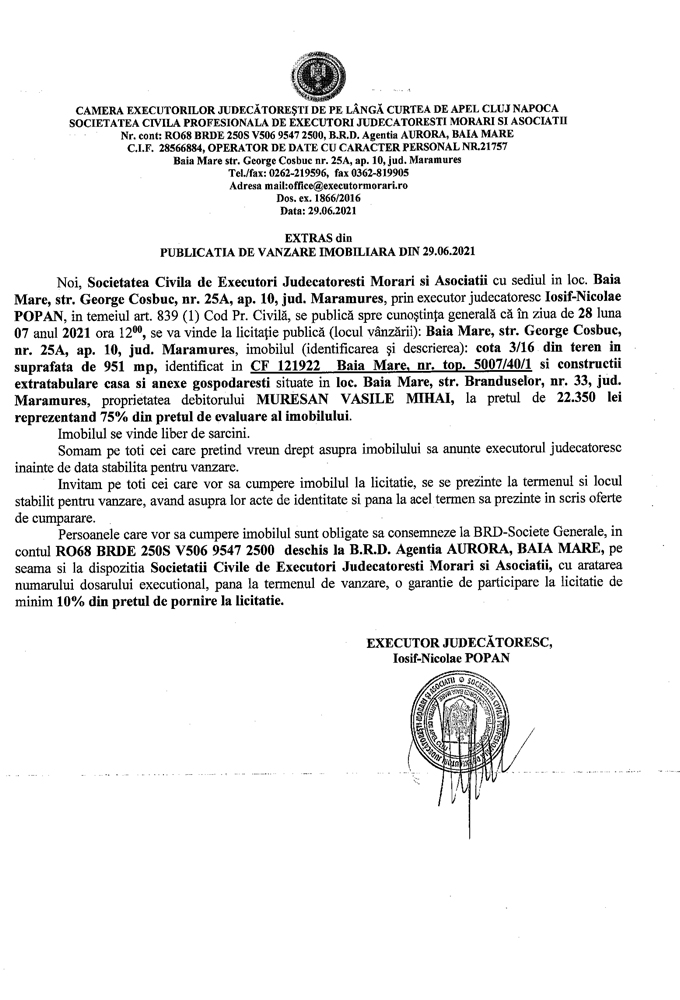 Noi, Societatea Civilă Profesională de Executori Judecătorești Morari și Asociații cu sediul în loc. Baia Mare, str. George Coșbuc, nr. 25A, ap. 10, jud. Maramureș, prin executor judecătoresc Iosif-Nicolae POPAN în temeiul art. 839 (1) Cod. Pr. Civilă, se publică spre cunoștința generală că în ziua de 28 luna 07 anul 2021 ora 12.00 se va vinde la licitație publică (locul vânzării): Baia Mare, str. George Coșbuc, nr. 25A, ap. 10, jud Maramureș imobilul descris în documentul de mai jos: