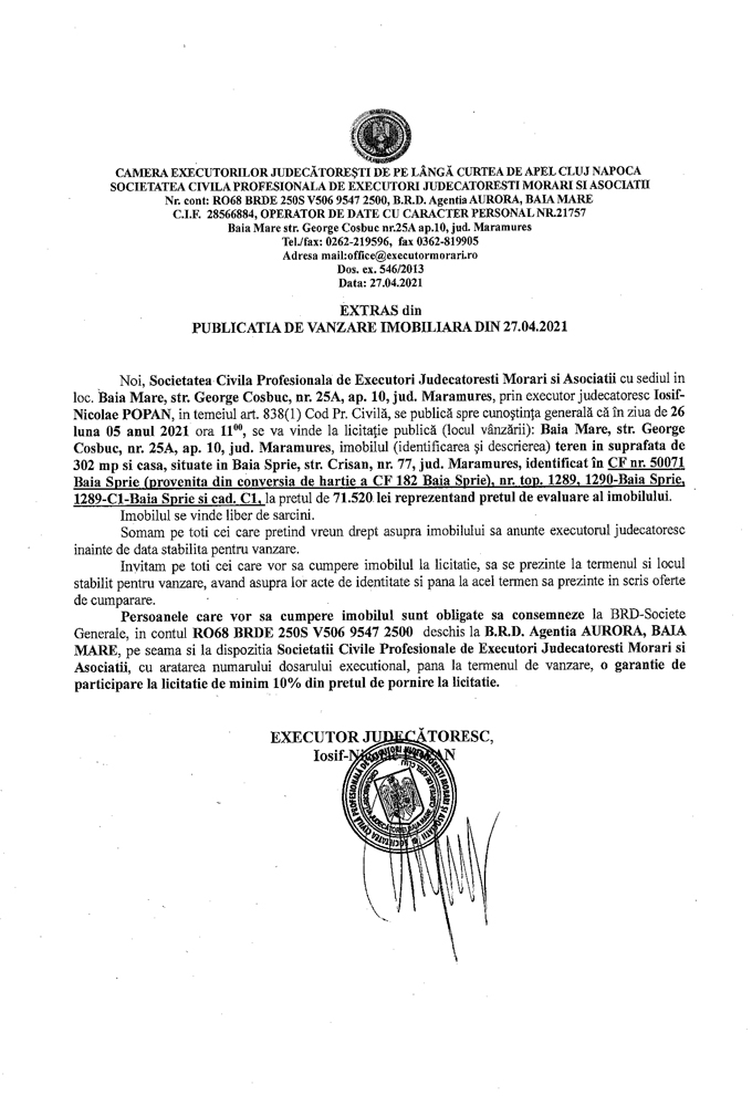 Noi, Societatea Civilă Profesională de Executori Judecătorești Morari și Asociații cu sediul în loc. Baia Mare, str. George Coșbuc, nr. 25A, ap. 10, jud. Maramureș, prin executor judecătoresc Iosif-Nicolae POPAN în temeiul art. 838(1) Cod. Pr. Civilă, se publică spre cunoștința generală că în ziua de 26 luna 05 anul 2021 ora 11.00 se va vinde la licitație publică (locul vânzării): Baia Mare, str. George Coșbuc, nr. 25A, ap. 10, jud Maramureș din imobilul descris în documentul de mai jos:
