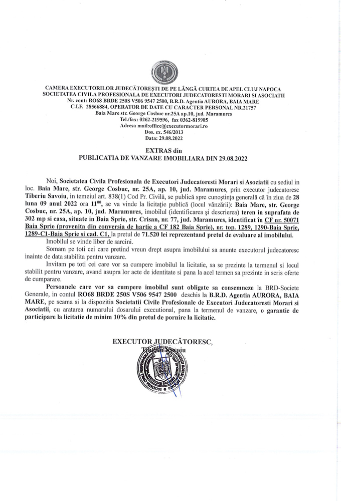 Noi, Societatea Civilă Profesională de Executori Judecătorești Morari și Asociații cu sediul în loc. Baia Mare, str. George Coșbuc, nr. 25A, ap. 10, jud. Maramureș, prin executor judecătoresc Tiberiu SĂVOIU, în temeiul art. 838(1) Cod. Pr. Civilă, se publică spre cunoștința generală că în ziua de 28 luna 09 anul 2022 ora 11.00, se va vinde la licitație publică (locul vânzării): Baia Mare, str. George Coșbuc, nr. 25A, ap. 10, jud Maramureș, imobilul descris în documentul de mai jos: