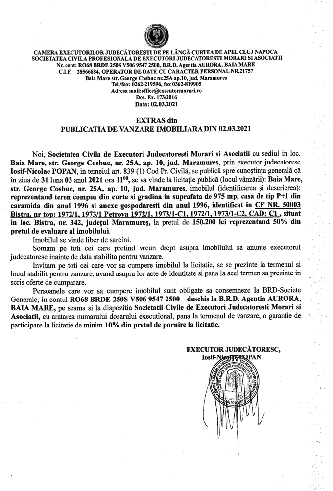 Noi, Societatea Civilă Profesională de Executori Judecătorești Morari și Asociații cu sediul în loc. Baia Mare, str. George Coșbuc, nr. 25A, ap. 10, jud. Maramureș, prin executor judecătoresc Iosif-Nicolae POPAN în temeiul art. 839 (1) Cod. Pr. Civilă, se publică spre cunoștința generală că în ziua de 31 luna 03 anul 2021 ora 11.00 se va vinde la licitație publică (locul vânzării): Baia Mare, str. George Coșbuc, nr. 25A, ap. 10, jud Maramureș din imobilul descris în documentul de mai jos: