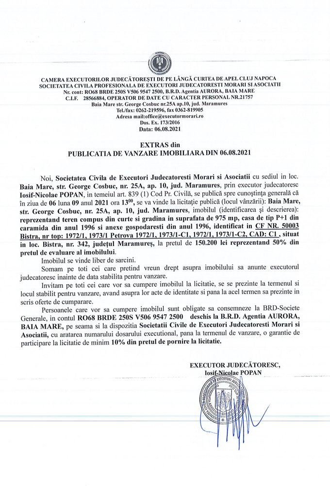 Noi, Societatea Civilă Profesională de Executori Judecătorești Morari și Asociații cu sediul în loc. Baia Mare, str. George Coșbuc, nr. 25A, ap. 10, jud. Maramureș, prin executor judecătoresc Iosif-Nicolae POPAN în temeiul art. 839 (1) Cod. Pr. Civilă, se publică spre cunoștința generală că în ziua de 06 luna 09 anul 2021 ora 13.00 se va vinde la licitație publică (locul vânzării): Baia Mare, str. George Coșbuc, nr. 25A, ap. 10, jud Maramureș imobilul descris în documentul de mai jos: