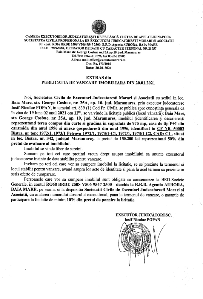 Noi, Societatea Civilă Profesională de Executori Judecătorești Morari și Asociații cu sediul în loc. Baia Mare, str. George Coșbuc, nr. 25A, ap. 10, jud. Maramureș, prin executor judecătoresc Iosif-Nicolae POPAN în temeiul art. 839 (1) Cod. Pr. Civilă, se publică spre cunoștința generală că în ziua de 19 luna 02 anul 2021 ora 11.00 se va vinde la licitație publică (locul vânzării): Baia Mare, str. George Coșbuc, nr. 25A, ap. 10, jud Maramureș din imobilul descris în documentul de mai jos: