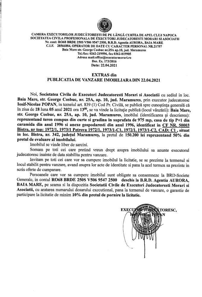 Noi, Societatea Civilă Profesională de Executori Judecătorești Morari și Asociații cu sediul în loc. Baia Mare, str. George Coșbuc, nr. 25A, ap. 10, jud. Maramureș, prin executor judecătoresc Iosif Nicolae POPAN în temeiul art. 839 (1) Cod. Pr. Civilă, se publică spre cunoștința generală că în ziua de 18 luna 05 anul 2021 ora 13.00 se va vinde la licitație publică (locul vânzării): Baia Mare, str. George Coșbuc, nr. 25A, ap. 10, jud Maramureș din imobilul descris în documentul de mai jos: