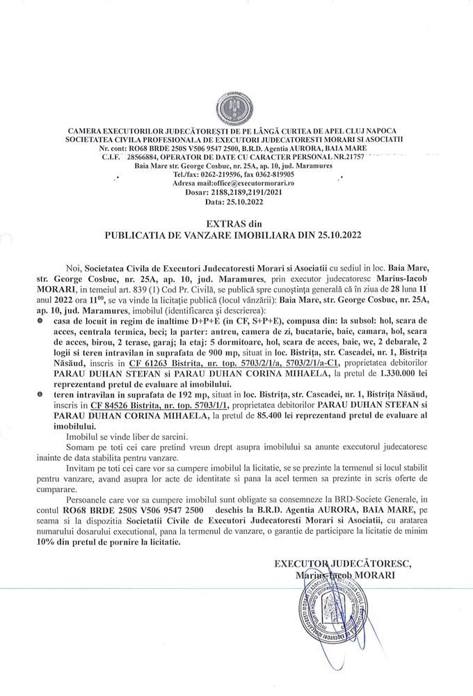 Noi, Societatea Civilă Profesională de Executori Judecătorești Morari și Asociații cu sediul în loc. Baia Mare, str. George Coșbuc, nr. 25A, ap. 10, jud. Maramureș, prin executor judecătoresc Marius-Iacob MORARI, în temeiul art. 839 (1) Cod. Pr. Civilă, se publică spre cunoștința generală că în ziua de 28 luna 11 anul 2022 ora 11.00, se va vinde la licitație publică (locul vânzării): Baia Mare, str. George Coșbuc, nr. 25A, ap. 10, jud Maramureș, imobilul descris în documentul de mai jos: