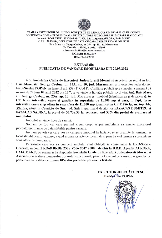 alNoi, Societatea Civilă Profesională de Executori Judecătorești Morari și Asociații cu sediul în loc. Baia Mare, str. George Coșbuc, nr. 25A, ap. 10, jud. Maramureș, prin executor judecătoresc Iosif-Nicolae POPAN în temeiul art. 839 (1) Cod. Pr. Civilă, se publică spre cunoștința generală că în ziua de 29 luna 04 anul 2022 ora 12.00, se va vinde la licitație publică (locul vânzării): Baia Mare, str. George Coșbuc, nr. 25A, ap. 10, jud Maramureș, imobilul descris în documentul de mai jos: