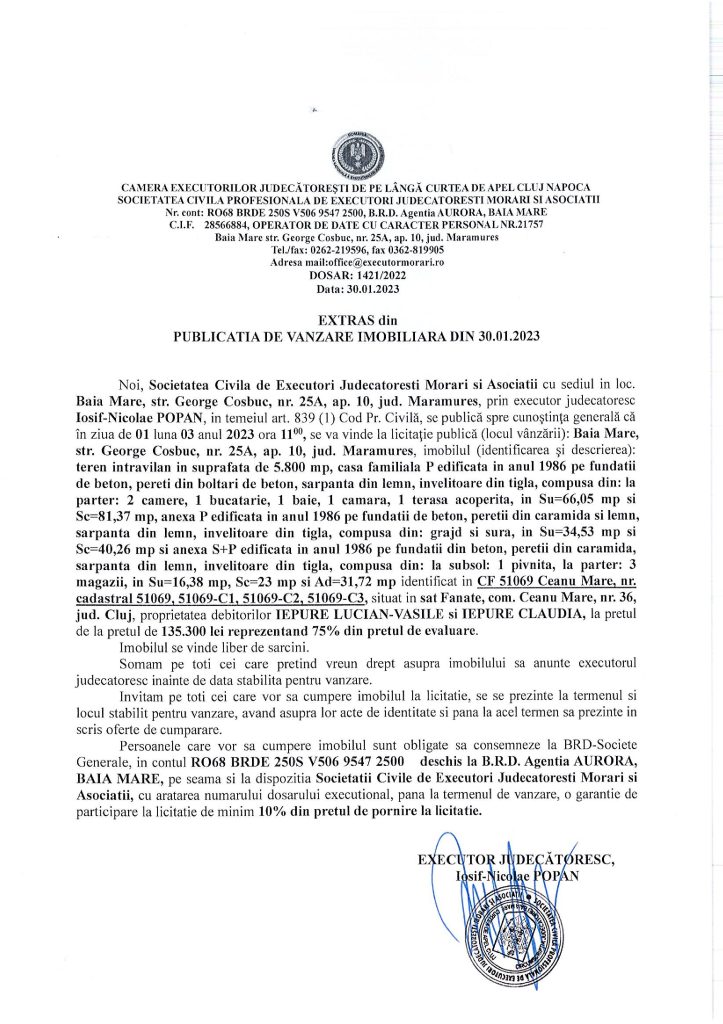 Vânzare casă și teren în Fânațe, jud. Cluj – Extras publicație imobiliară, din data de 23. 01. 2023