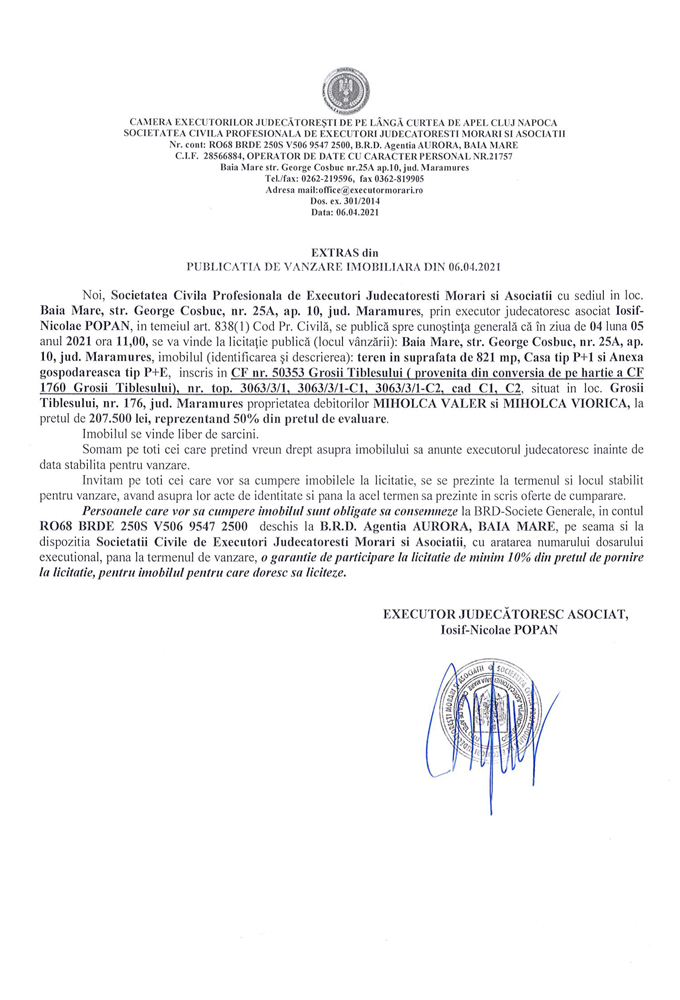 Noi, Societatea Civilă Profesională de Executori Judecătorești Morari și Asociații cu sediul în loc. Baia Mare, str. George Coșbuc, nr. 25A, ap. 10, jud. Maramureș, prin executor judecătoresc Iosif-Nicolae POPAN în temeiul art. 838(1) Cod. Pr. Civilă, se publică spre cunoștința generală că în ziua de 04 luna 05 anul 2021 ora 11,00 se va vinde la licitație publică (locul vânzării): Baia Mare, str. George Coșbuc, nr. 25A, ap. 10, jud Maramureș din imobilul descris în documentul de mai jos: