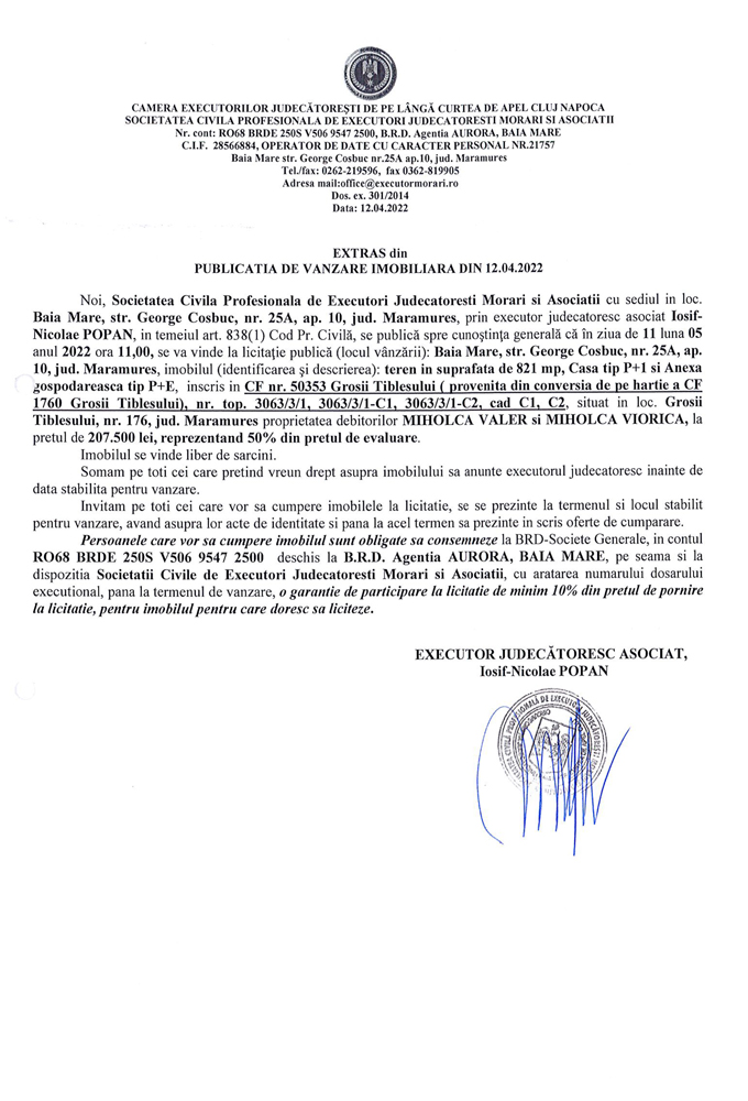 Noi, Societatea Civilă Profesională de Executori Judecătorești Morari și Asociații cu sediul în loc. Baia Mare, str. George Coșbuc, nr. 25A, ap. 10, jud. Maramureș, prin executor judecătoresc asociat Iosif-Nicolae POPAN în temeiul art. 838(1) Cod. Pr. Civilă, se publică spre cunoștința generală că în ziua de 11 luna 05 anul 2022 ora 11,00, se va vinde la licitație publică (locul vânzării): Baia Mare, str. George Coșbuc, nr. 25A, ap. 10, jud Maramureș, imobilul descris în documentul de mai jos: