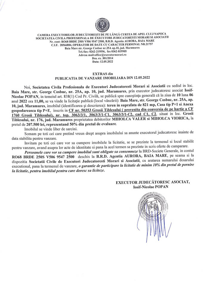 Noi, Societatea Civilă Profesională de Executori Judecătorești Morari și Asociații cu sediul în loc. Baia Mare, str. George Coșbuc, nr. 25A, ap. 10, jud. Maramureș, prin executor judecătoresc asociat Iosif-Nicolae POPAN în temeiul art. 838(1) Cod. Pr. Civilă, se publică spre cunoștința generală că în ziua de 10 luna 06 anul 2022 ora 11,00, se va vinde la licitație publică (locul vânzării): Baia Mare, str. George Coșbuc, nr. 25A, ap. 10, jud Maramureș, imobilul descris în documentul de mai jos: