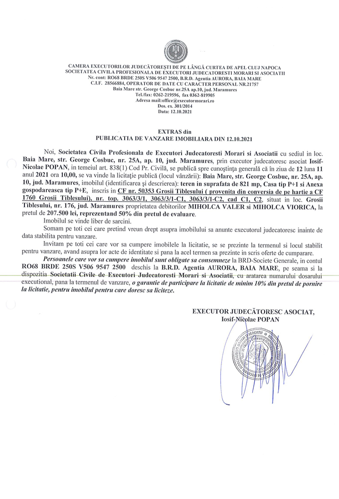 Noi, Societatea Civilă Profesională de Executori Judecătorești Morari și Asociații cu sediul în loc. Baia Mare, str. George Coșbuc, nr. 25A, ap. 10, jud. Maramureș, prin executor judecătoresc asociat Iosif-Nicolae POPAN în temeiul art. 838(1) Cod. Pr. Civilă, se publică spre cunoștința generală că în ziua de 12 luna 11 anul 2021 ora 10,00, se va vinde la licitație publică (locul vânzării): Baia Mare, str. George Coșbuc, nr. 25A, ap. 10, jud Maramureș, imobilul descris în documentul de mai jos: