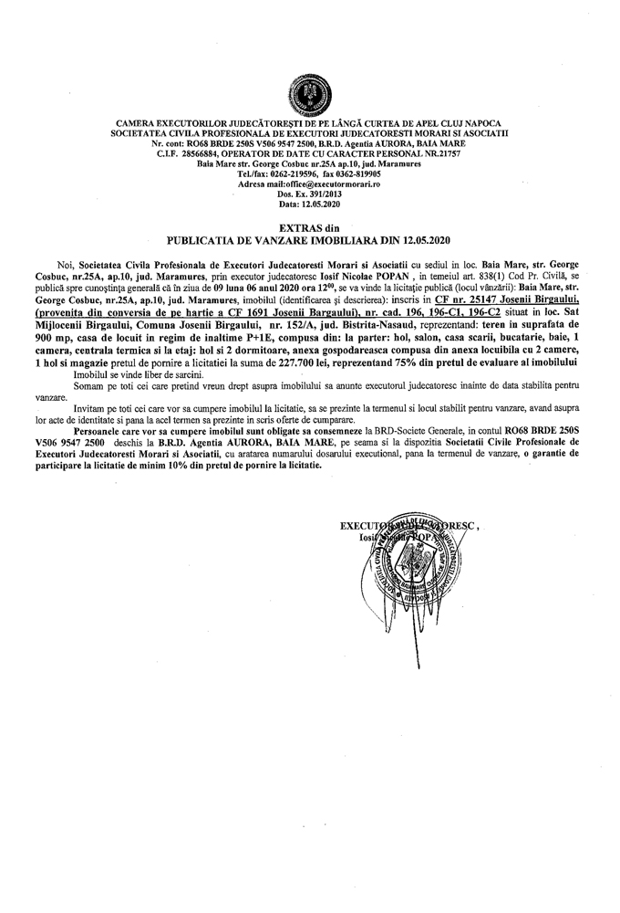 Noi, Societatea Civilă Profesională de Executori Judecătorești Morari și Asociații cu sediul în loc. Baia Mare, str. George Coșbuc, nr. 25A, ap. 10, jud. Maramureș, prin executor judecătoresc Iosif-Nicolae POPAN, în temeiul art. 838(1) Cod. Pr. Civilă, se publică spre cunoștința generală că în ziua de 09 luna 06 anul 2020 ora 12.00, se va vinde la licitație publică (locul vânzării): Baia Mare, str. George Coșbuc, nr. 25A, ap. 10, jud Maramureș din imobilul descris în documentul de mai jos:
