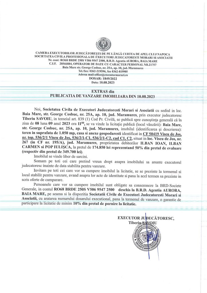 Vânzare casă și teren în Vișeu de Jos – Extras publicație imobiliară, din data de 10. 08. 2023
