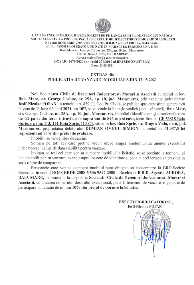 Noi, Societatea Civilă Profesională de Executori Judecătorești Morari și Asociații cu sediul în loc. Baia Mare, str. George Coșbuc, nr. 25A, ap. 10, jud. Maramureș, prin executor judecătoresc Iosif-Nicolae POPAN în temeiul art. 839 (1) Cod. Pr. Civilă, se publică spre cunoștința generală că în ziua de 11 luna 06 anul 2021 ora 10.00 se va vinde la licitație publică (locul vânzării): Baia Mare, str. George Coșbuc, nr. 25A, ap. 10, jud Maramureș cota 1/2 din imobilul descris în documentul de mai jos: