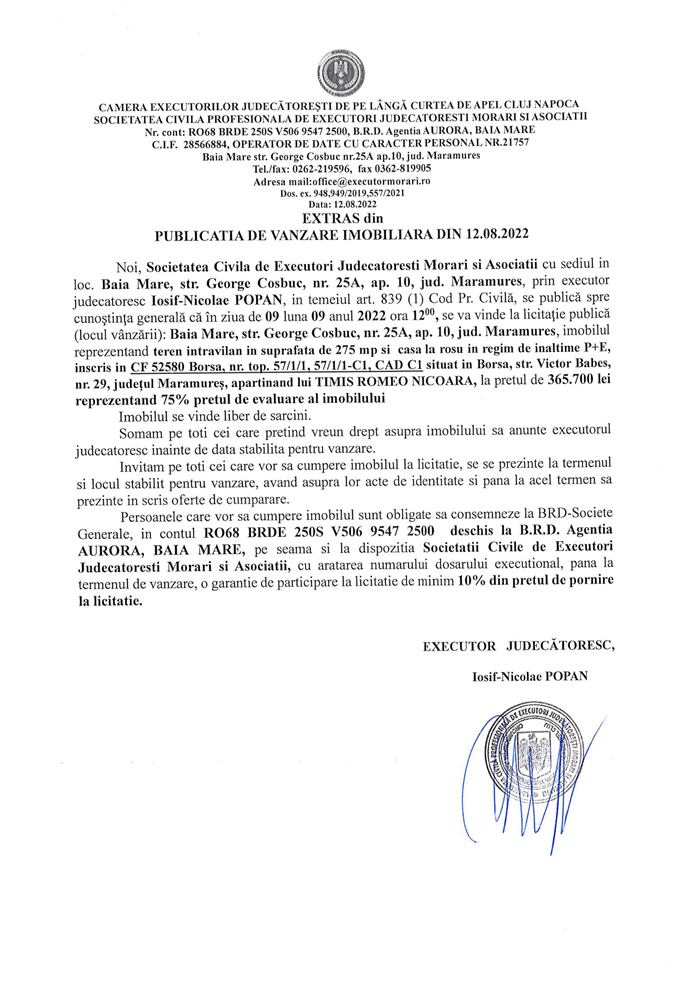 Noi, Societatea Civilă Profesională de Executori Judecătorești Morari și Asociații cu sediul în loc. Baia Mare, str. George Coșbuc, nr. 25A, ap. 10, jud. Maramureș, prin executor judecătoresc Iosif-Nicolae POPAN, în temeiul art. 839 (1) Cod. Pr. Civilă, se publică spre cunoștința generală că în ziua de 09 luna 09 anul 2022 ora 12.00, se va vinde la licitație publică (locul vânzării): Baia Mare, str. George Coșbuc, nr. 25A, ap. 10, jud Maramureș, imobilul descris în documentul de mai jos: