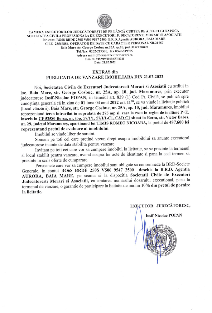 Noi, Societatea Civilă Profesională de Executori Judecătorești Morari și Asociații cu sediul în loc. Baia Mare, str. George Coșbuc, nr. 25A, ap. 10, jud. Maramureș, prin executor judecătoresc Iosif-Nicolae POPAN în temeiul art. 839 (1) Cod. Pr. Civilă, se publică spre cunoștința generală că în ziua de 01 luna 04 anul 2022 ora 11.00, se va vinde la licitație publică (locul vânzării): Baia Mare, str. George Coșbuc, nr. 25A, ap. 10, jud Maramureș, imobilul descris în documentul de mai jos: