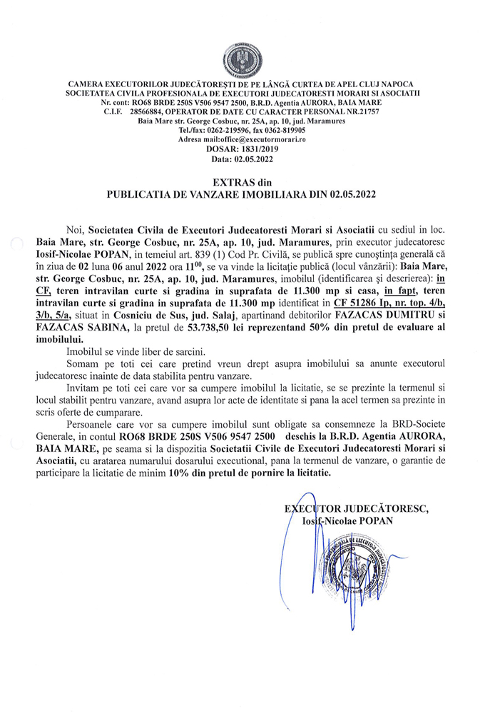 Noi, Societatea Civilă Profesională de Executori Judecătorești Morari și Asociații cu sediul în loc. Baia Mare, str. George Coșbuc, nr. 25A, ap. 10, jud. Maramureș, prin executor judecătoresc Iosif-Nicolae POPAN în temeiul art. 839 (1) Cod. Pr. Civilă, se publică spre cunoștința generală că în ziua de 02 luna 06 anul 2022 ora 11.00, se va vinde la licitație publică (locul vânzării): Baia Mare, str. George Coșbuc, nr. 25A, ap. 10, jud Maramureș, imobilul descris în documentul de mai jos: