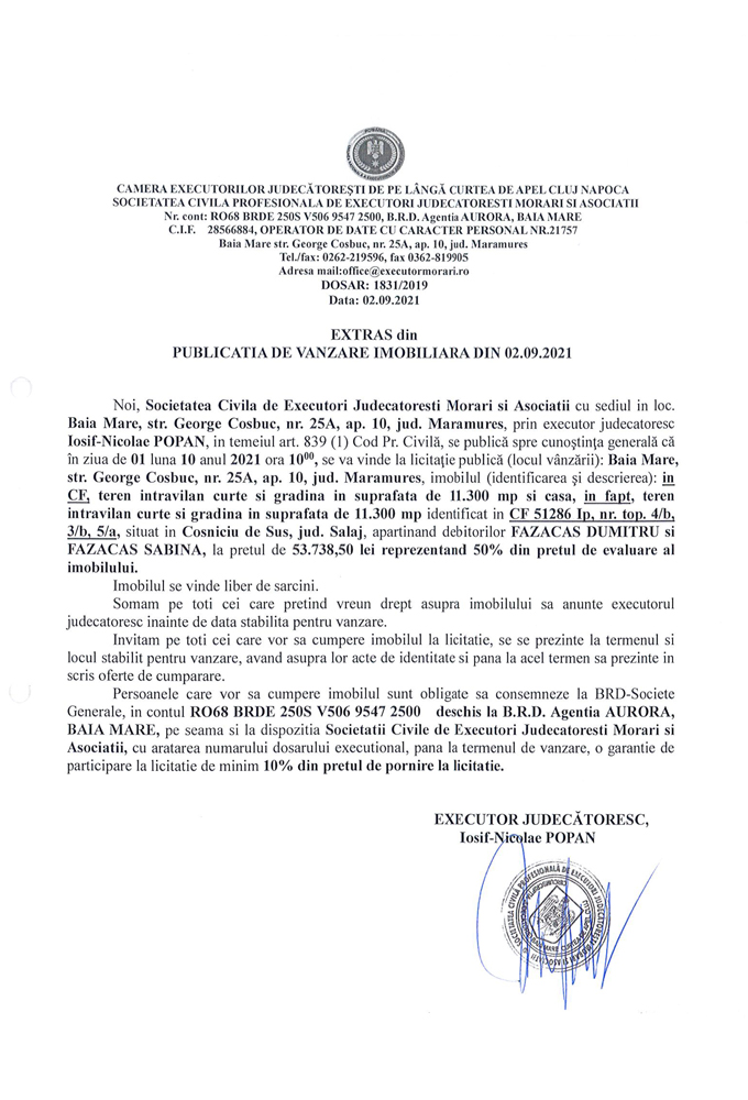 Noi, Societatea Civilă Profesională de Executori Judecătorești Morari și Asociații cu sediul în loc. Baia Mare, str. George Coșbuc, nr. 25A, ap. 10, jud. Maramureș, prin executor judecătoresc Iosif-Nicolae POPAN în temeiul art. 839 (1) Cod. Pr. Civilă, se publică spre cunoștința generală că în ziua de 01 luna 10 anul 2021 ora 10.00 se va vinde la licitație publică (locul vânzării): Baia Mare, str. George Coșbuc, nr. 25A, ap. 10, jud Maramureș imobilul descris în documentul de mai jos: