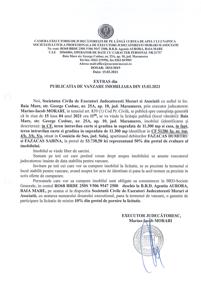 Noi, Societatea Civilă Profesională de Executori Judecătorești Morari și Asociații cu sediul în loc. Baia Mare, str. George Coșbuc, nr. 25A, ap. 10, jud. Maramureș, prin executor judecătoresc Marius-Iacob MORARI în temeiul art. 839 (1) Cod. Pr. Civilă, se publică spre cunoștința generală că în ziua de 14 luna 04 anul 2021 ora 11.00 se va vinde la licitație publică (locul vânzării): Baia Mare, str. George Coșbuc, nr. 25A, ap. 10, jud Maramureș din imobilul descris în documentul de mai jos: