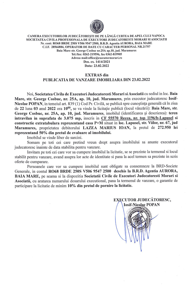 Noi, Societatea Civilă Profesională de Executori Judecătorești Morari și Asociații cu sediul în loc. Baia Mare, str. George Coșbuc, nr. 25A, ap. 10, jud. Maramureș, prin executor judecătoresc Iosif-Nicolae POPAN în temeiul art. 839 (1) Cod. Pr. Civilă, se publică spre cunoștința generală că în ziua de 22 luna 03 anul 2022 ora 10.00, se va vinde la licitație publică (locul vânzării): Baia Mare, str. George Coșbuc, nr. 25A, ap. 10, jud Maramureș, imobilul descris în documentul de mai jos: