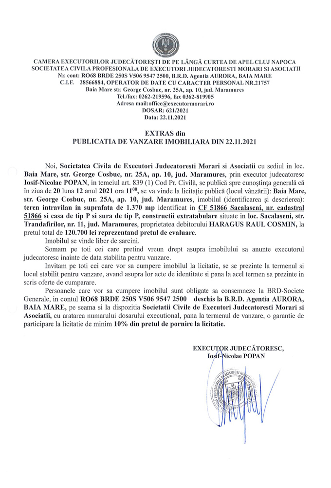 Noi, Societatea Civilă Profesională de Executori Judecătorești Morari și Asociații cu sediul în loc. Baia Mare, str. George Coșbuc, nr. 25A, ap. 10, jud. Maramureș, prin executor judecătoresc Iosif-Nicolae POPAN în temeiul art. 839 (1) Cod. Pr. Civilă, se publică spre cunoștința generală că în ziua de 20 luna 12 anul 2021 ora 11.00, se va vinde la licitație publică (locul vânzării): Baia Mare, str. George Coșbuc, nr. 25A, ap. 10, jud Maramureș, imobilul descris în documentul de mai jos: