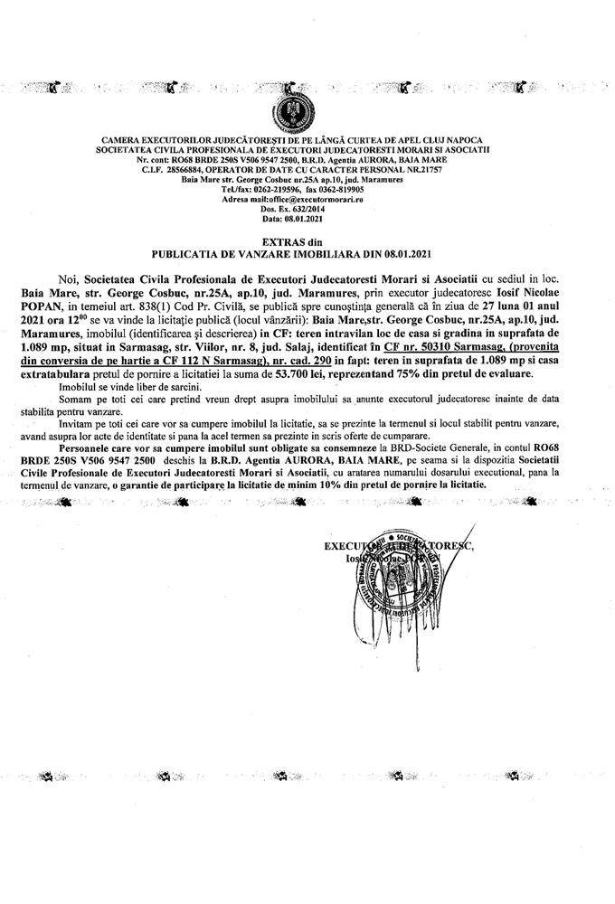 Noi, Societatea Civilă Profesională de Executori Judecătorești Morari și Asociații cu sediul în loc. Baia Mare, str. George Coșbuc, nr. 25A, ap. 10, jud. Maramureș, prin executor judecătoresc Iosif Nicolae POPAN în temeiul art. 838(1) Cod. Pr. Civilă, se publică spre cunoștința generală că în ziua de 27 luna 01 anul 2021 ora 12.00 se va vinde la licitație publică (locul vânzării): Baia Mare, str. George Coșbuc, nr. 25A, ap. 10, jud Maramureș din imobilul descris în documentul de mai jos: