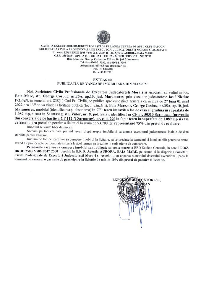Noi, Societatea Civilă Profesională de Executori Judecătorești Morari și Asociații cu sediul în loc. Baia Mare, str. George Coșbuc, nr. 25A, ap. 10, jud. Maramureș, prin executor judecătoresc Iosif Nicolae POPAN în temeiul art. 838(1) Cod. Pr. Civilă, se publică spre cunoștința generală că în ziua de 27 luna 01 anul 2022 ora 13.00, se va vinde la licitație publică (locul vânzării): Baia Mare, str. George Coșbuc, nr. 25A, ap. 10, jud Maramureș, imobilul descris în documentul de mai jos: