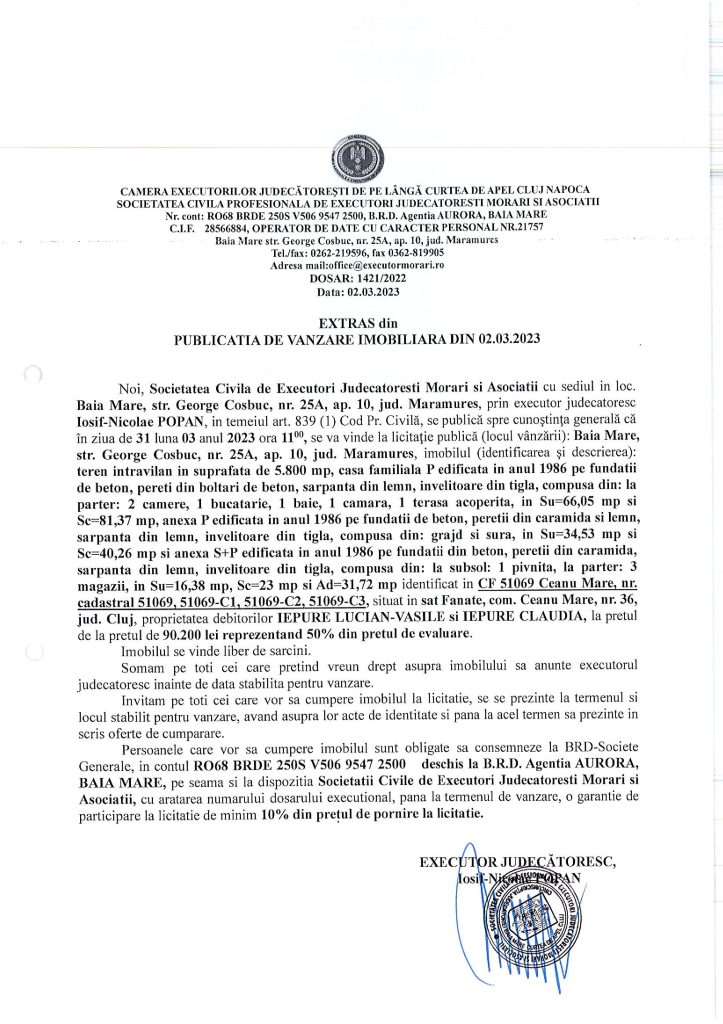 Vânzare casă și teren intravilan în sat Fânațe, jud. Cluj – Extras publicatie imobiliara, din data de 02. 03. 2023