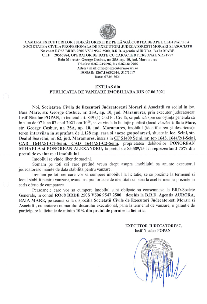 Noi, Societatea Civilă Profesională de Executori Judecătorești Morari și Asociații cu sediul în loc. Baia Mare, str. George Coșbuc, nr. 25A, ap. 10, jud. Maramureș, prin executor judecătoresc Iosif-Nicolae POPAN în temeiul art. 839 (1) Cod. Pr. Civilă, se publică spre cunoștința generală că în ziua de 07 luna 07 anul 2021 ora 10.00 se va vinde la licitație publică (locul vânzării): Baia Mare, str. George Coșbuc, nr. 25A, ap. 10, jud Maramureș imobilul descris în documentul de mai jos: